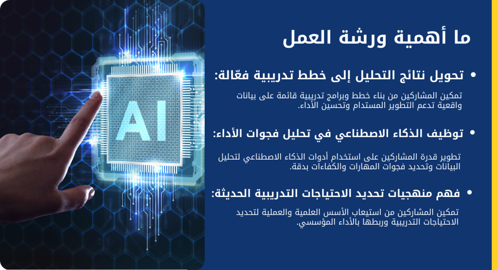 حوّل التدريب من نشاط روتيني إلى قرار استراتيجي مدعوم بالبيانات الضخمة والذكاء الاصطناعي. في ورشتنا، ستتعلم كيفية تشخيص الاحتياجات بدقة، الاستفادة من مراكز التقييم المتقدمة، وربط كل برنامج تدريبي بالأهداف المؤسسية. نصمم لك حلولًا تدريبية ذكية، ذات أثر ملموس وقابل للقياس، لتحويل كل ميزانية تدريب إلى استثمار حقيقي في الأداء والقيمة.